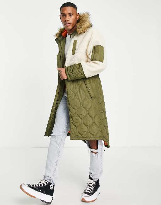 Abrigo largo caqui con capucha y borreguito en contraste de Urbancode
