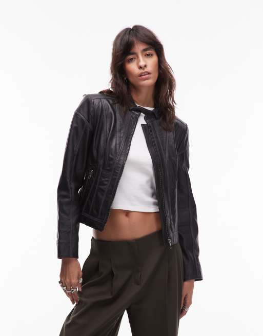Chaqueta negro desgastado de estilo motero con costuras en contraste de Urbancode