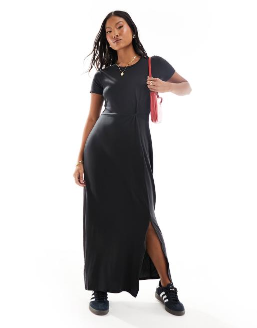 Vestido largo negro estilo camiseta con abertura y detalle anudado de Vero Moda Petite