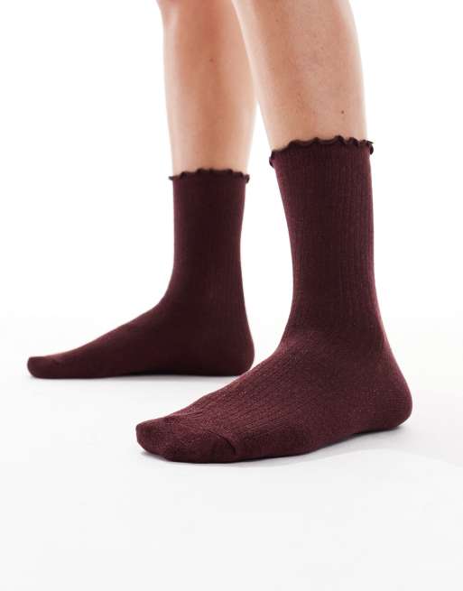 Calcetines burdeos efecto purpurina con borde de volantes de Vero Moda