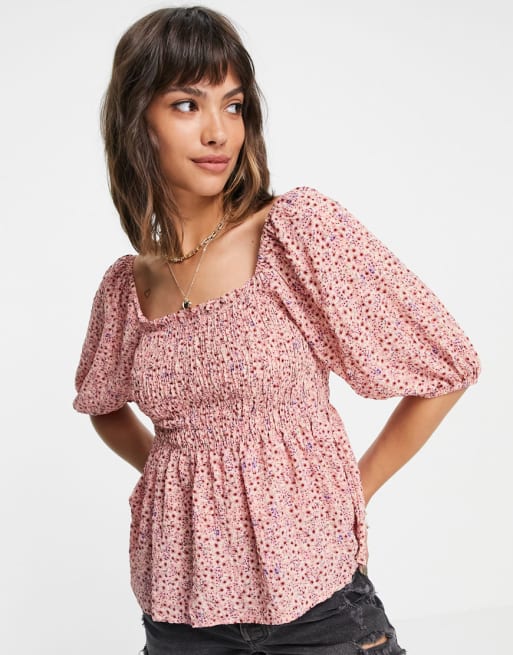 Conjunto rosa de blusa amplio fruncida y minifalda con estampado floral de Vero Moda