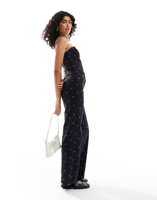 Conjunto vaquero negro de pantalones de pernera ancha y top corto con escote palabra de honor y detalle de lunares bordados de Vero Moda