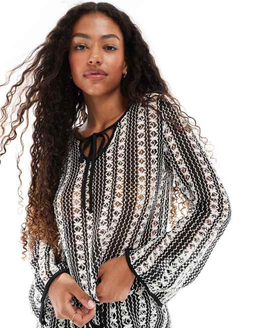 Top a rayas monocromáticas de manga larga de encaje de croché de Vero Moda (parte de un conjunto)
