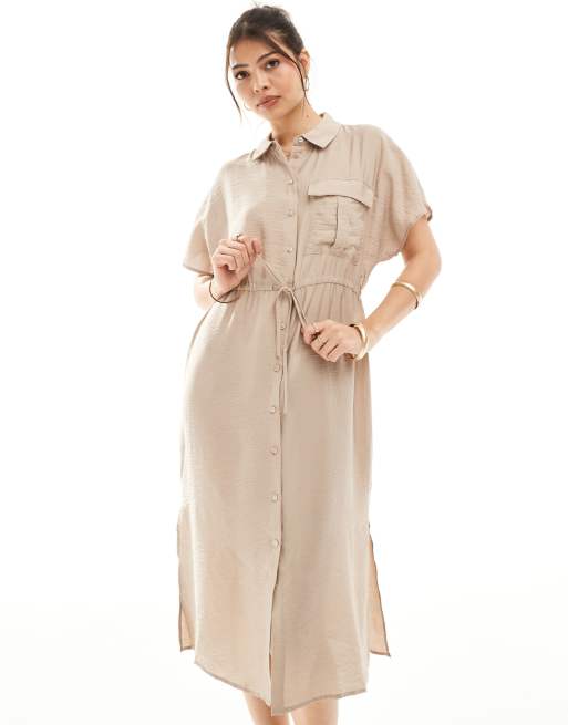 Vestido camisero color piedra con cinturón anudado y acabado repujado de Vero Moda