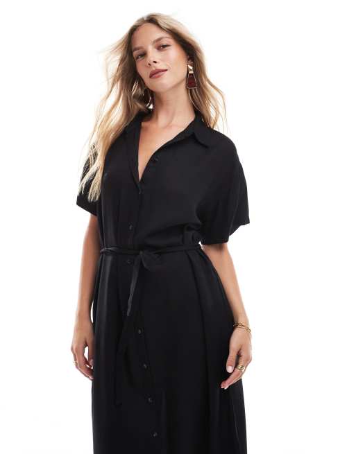 Vestido camisero midi negro con cinturón anudado de Vero Moda