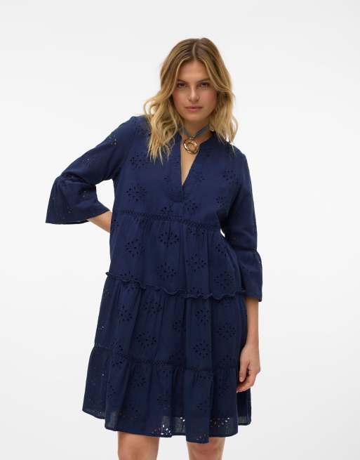 Vestido corto azul marino escalonado con diseño bordado y cuello de pico de Vero Moda