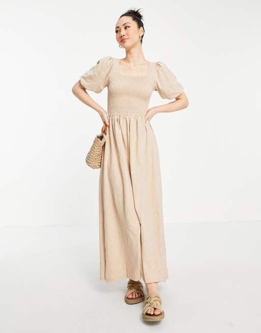 Vestido largo beis fruncido con mangas abullonadas de algodón de Vero Moda - BEIGE