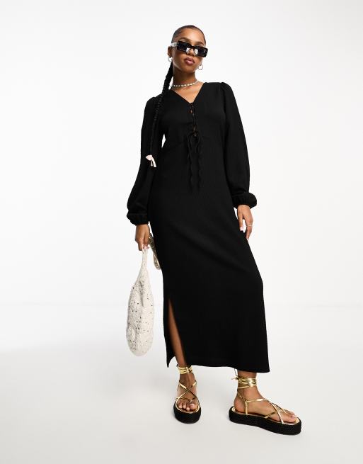 Vestido largo negro texturizado de manga larga con detalle de cordones de Vero Moda