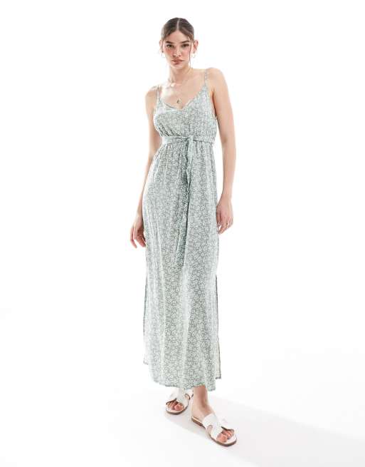 Vestido largo verde salvia con estampado floral, cuello de pico y lazada en la cintura de Vero Moda