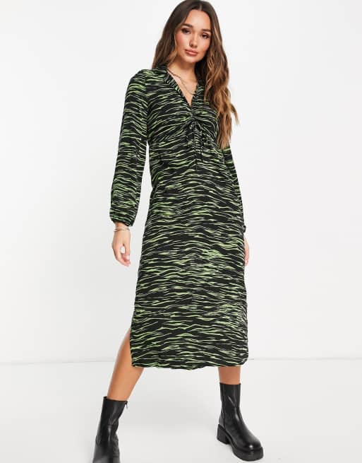 Vestido midi verde con estampado de cebra y parte delantera fruncida de Vero Moda