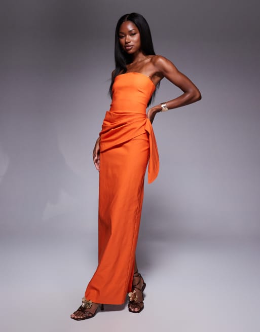 Vestido largo naranja con escote palabra de honor y detalle drapeado en la parte delantera de bengalina de Vesper