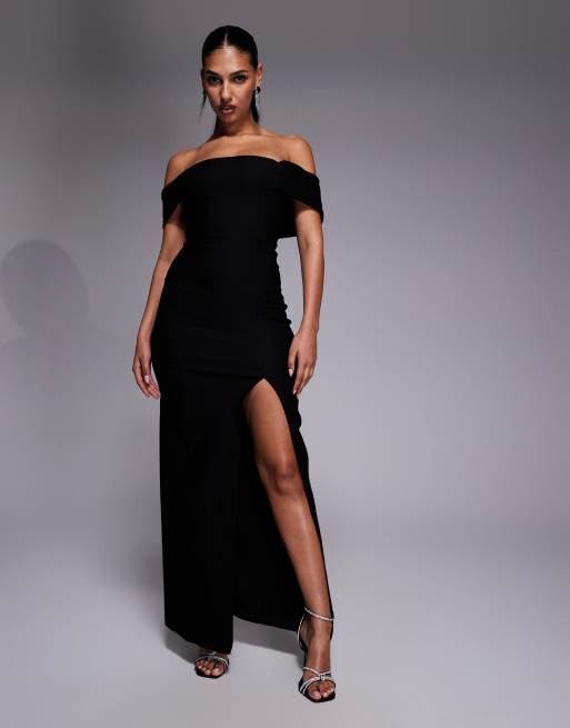Vestido largo negro ajustado con escote Bardot ancho y abertura hasta el muslo de bengalina de Vesper