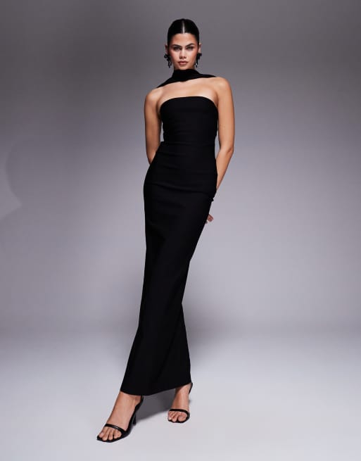Vestido largo negro con escote palabra de honor, detalle de gargantilla y botones traseros de bengalina de Vesper