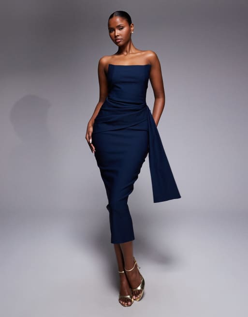 Vestido midi azul marino con escote palabra de honor con extremos cuadrados y detalle drapeado en la parte delantera de bengalina de Vesper