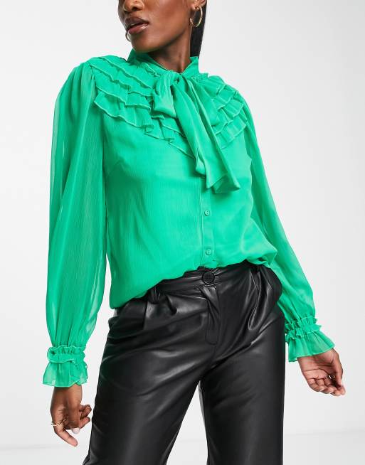 Camisa verde luminoso llamativo con volantes y lazada de Vila