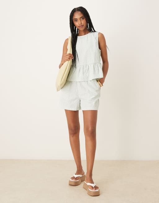 Conjunto a cuadros vichy verdes de pantalones cortos y top con volante en el bajo de VILA