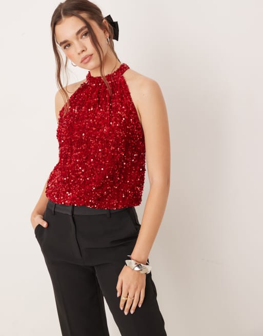 Top rojo con cuello halter de velour y lentejuelas de VILA
