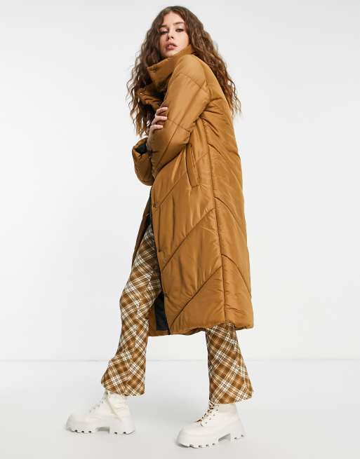 Abrigo de plumas largo tostado con cuello alzado de Violet Romance