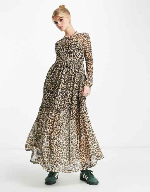 Vestido midi amplio y escalonado con estampado de leopardo de malla de Violet Romance
