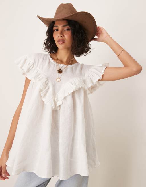 Top blanco de manga corta y estilo túnica de lino Viola de VRG GRL