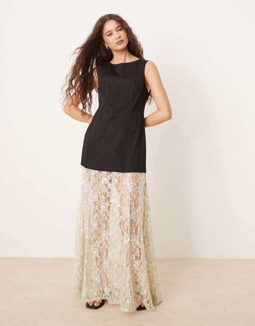 Vestido largo negro y plateado con lentejuelas en la falda Robbie de VRG GRL