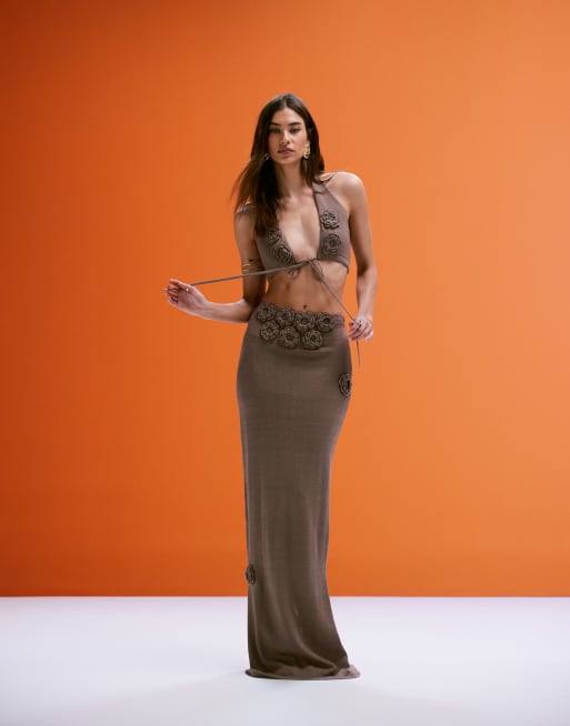 Conjunto beis cálido de falda larga y top estilo bralette con detalle de flor de punto Daisy de Wanderdoll
