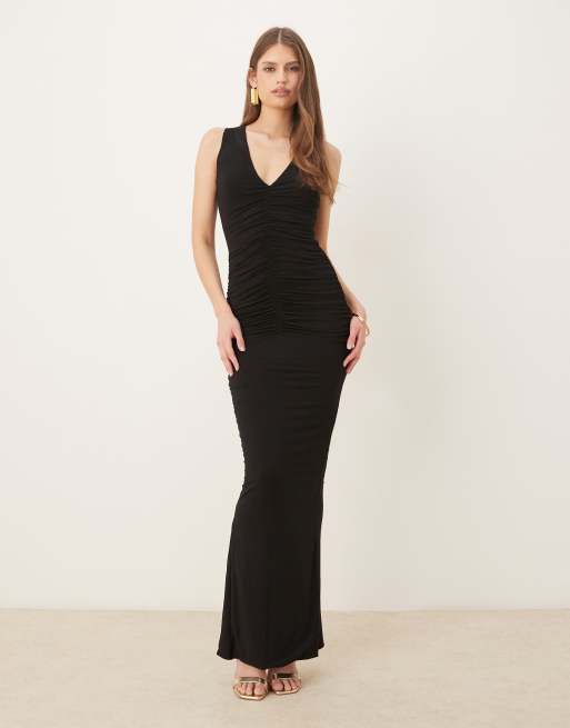 Vestido largo negro sin mangas efecto segunda piel moldeador con cuello escotado y detalle fruncido Tate de Wanderdoll
