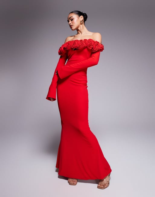 Vestido largo rojo muy ajustado con mangas acampanadas, escote Bardot y detalle de flores Ainsleigh de Wanderdoll