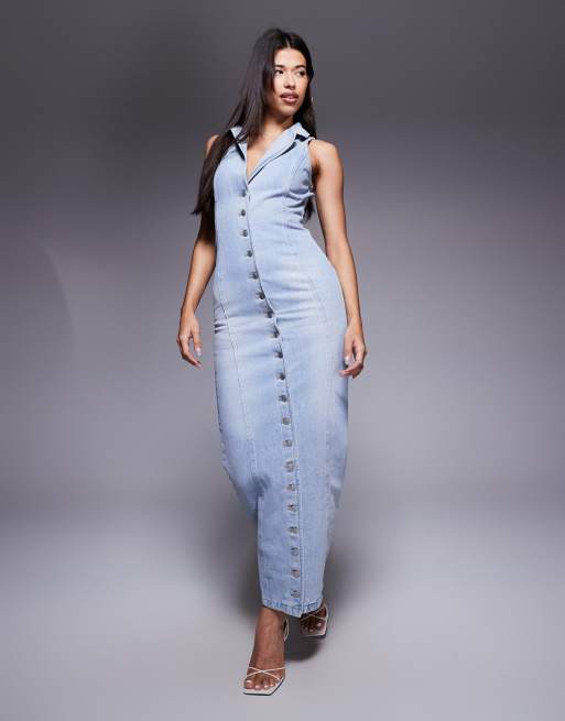 Vestido vaquero largo azul claro con cuello halter, espalda fruncida y detalle de solapas Kenny de Wanderdoll