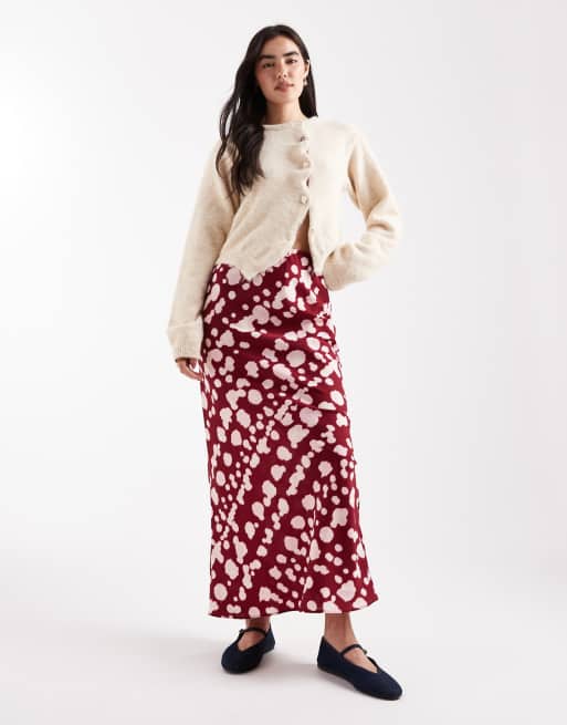 Falda semilarga burdeos y rosa de corte al bies con estampado de lunares efecto mancha de Wednesday's Girl