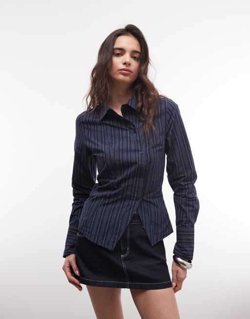 Camisa azul oscuro a rayas asimétrica con detalle de abertura de Weekday