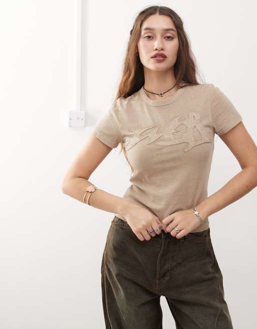 Camiseta beis lavado de corte estilo años 90 con aplicación gráfica Freja de Weekday