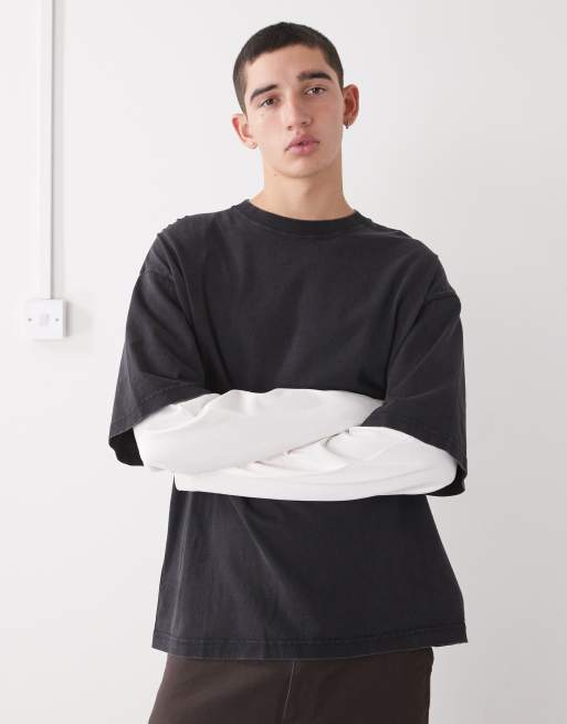 Camiseta negra extragrande con diseño de dos capas con mangas blanco hueso en contraste de Weekday