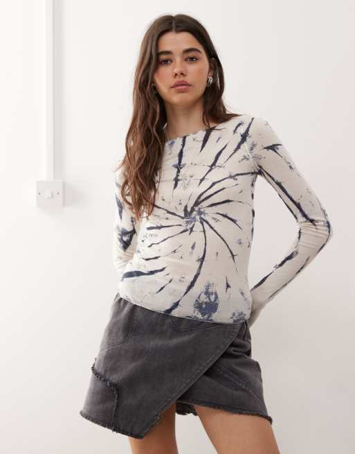 Top blanco de manga larga con estampado negro efecto tie dye y cuello barco de Weekday