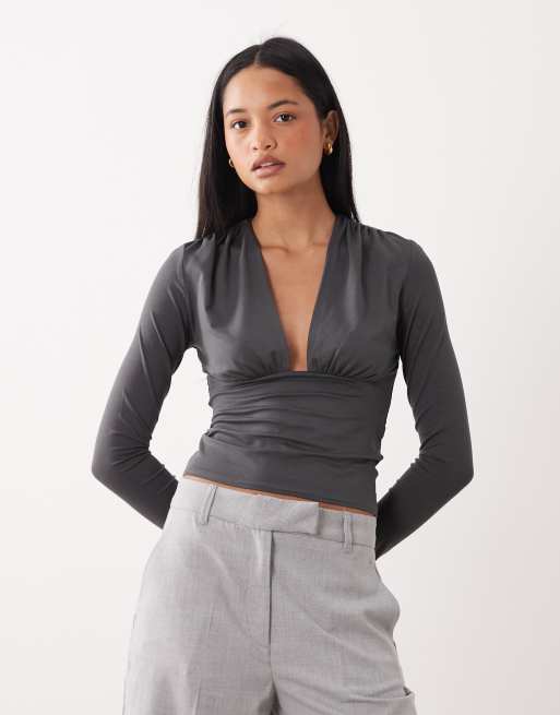 Top gris oscuro escotado de manga larga exclusivo en ASOS de Weekday
