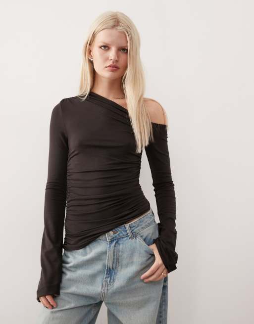 Top marrón oscuro con escote asimétrico de manga larga de Weekday