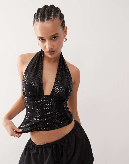 Top negro con cuello halter de lentejuelas Aline de Weekday
