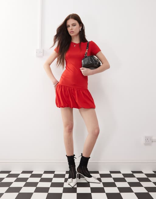 Vestido corto rojo estilo camiseta con falda abullonada de Weekday