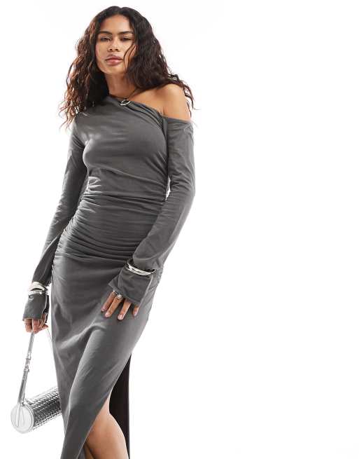 Vestido largo negro lavado drapeado con mangas largas acampanadas Erin de Weekday