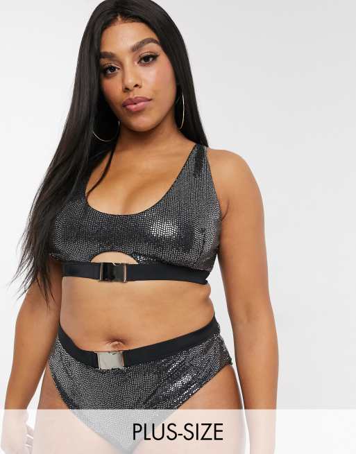 Braguitas de bikini de talle alto con detalle de hebilla en brillo negro exclusivas de Wolf & Whistle Curve