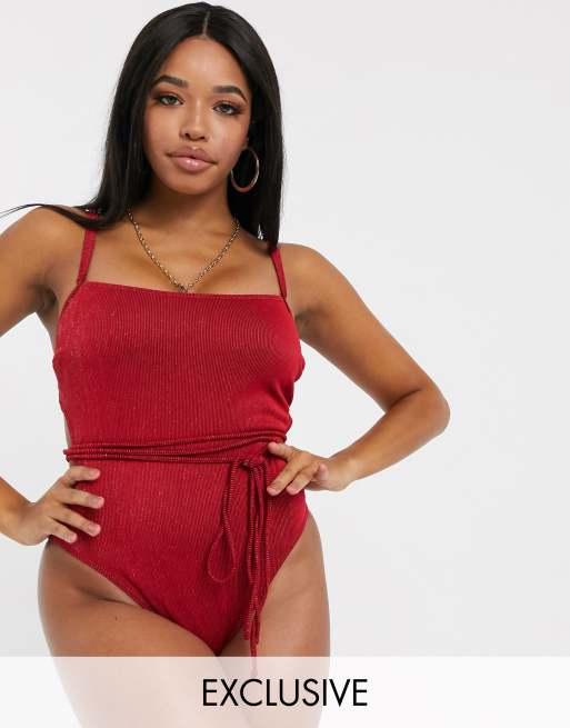Bañador de pernera alta y copas grandes con cintura anudada y diseño de canalé en rojo con purpurina y copas D-F de Wolf & Whistle