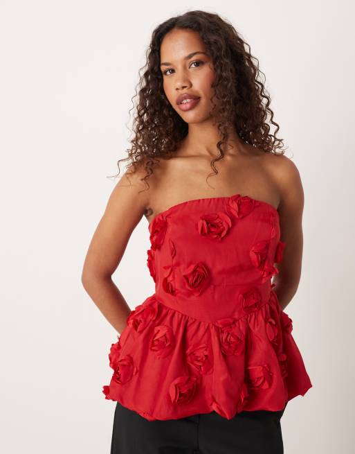 Top rojo con escote palabra de honor y aplicación de flor tridimensional de YAS