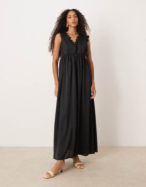 Vestido largo negro escotado en la parte delantera con detalle de borde festoneado de satén de YAS
