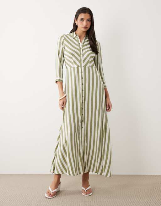 YAS - Vestido camisero largo a rayas blancas y verde oliva