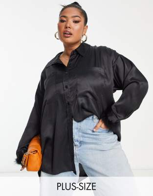 Camisa negra de satén con ribete de piel sintética en los puños de Yours