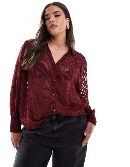Camisa rojo guinda con patrón devoré de tejido transparente de Yours