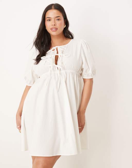 Esmee Curve Exclusive puff sleeve tie front mini beach dress in white
