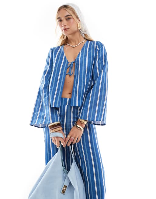 Esmee Exclusive tie front beach top with angel sleeve in blue stripe