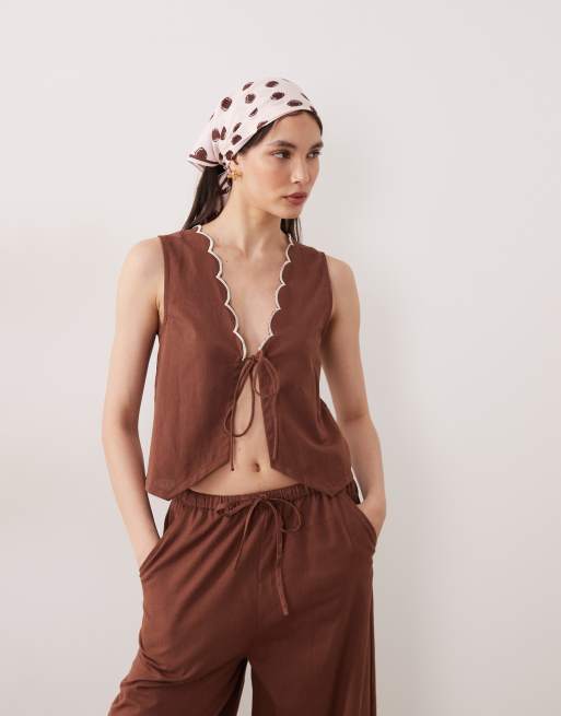 Esmee tie front beach top co-ord with cream scallop trim in brown