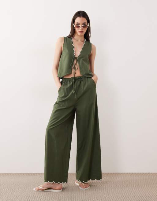 Esmee tie front beach trouser co-ord with cream scallop trim in olive